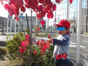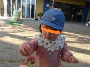 落ち葉や青桐の木の実を見つけると嬉しそうに拾っては、小さな手いっぱいに握りしめ、「どうぞ」と渡してくれる姿がとても微笑ましいです。