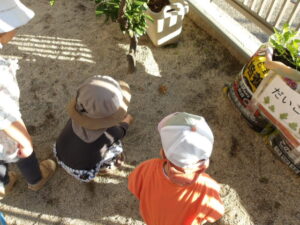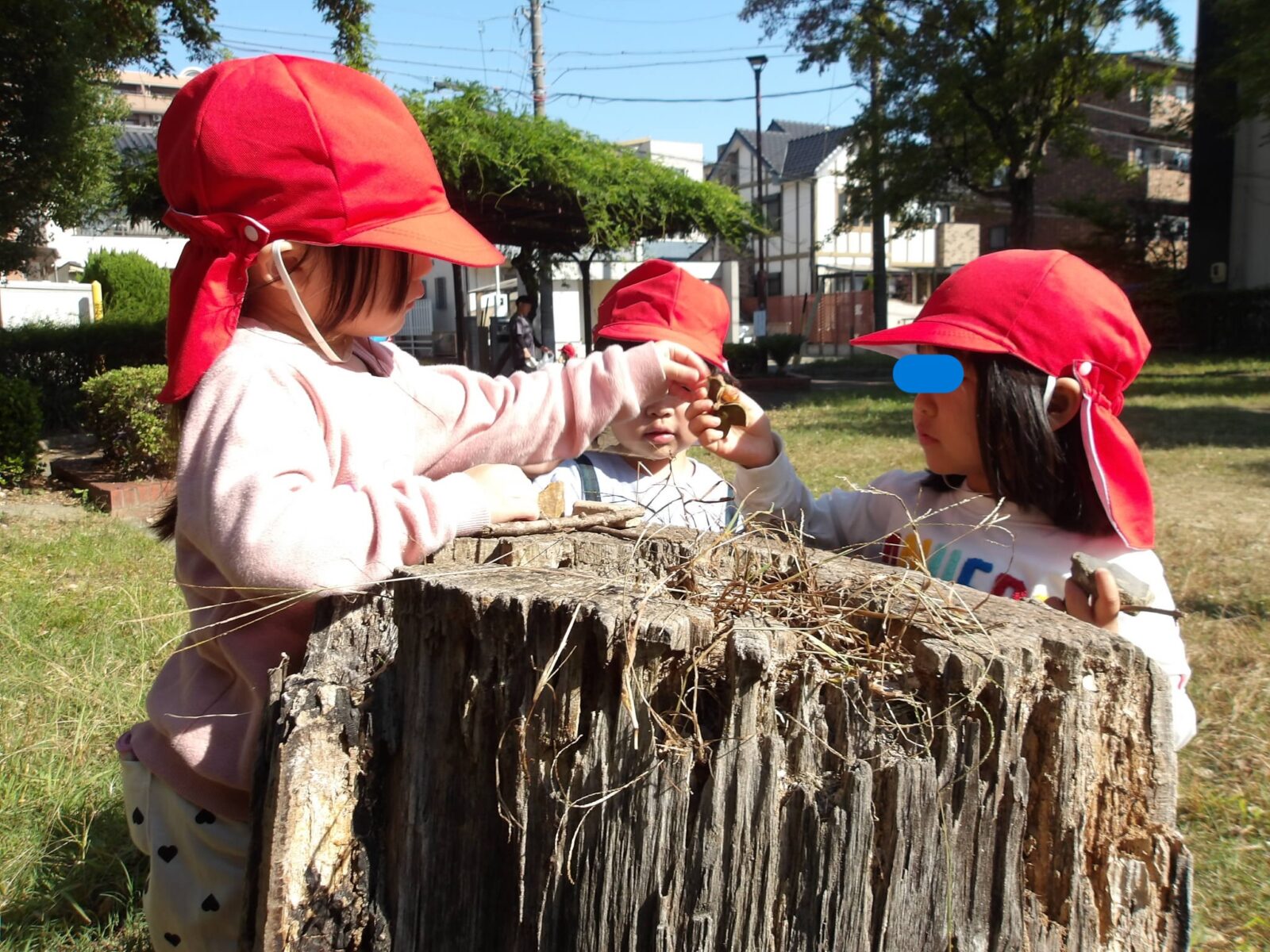 園庭では、その落ち葉や木の実を使ってお料理することを楽しんでいる子どもたち。