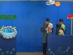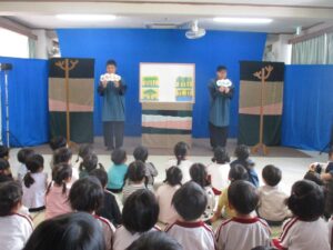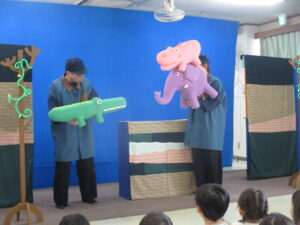 明野保育園に人形劇団「むすび座」さんが来園し、『ぞうくんのさんぽ』と『ぺらがえる』の2作品を観ました。