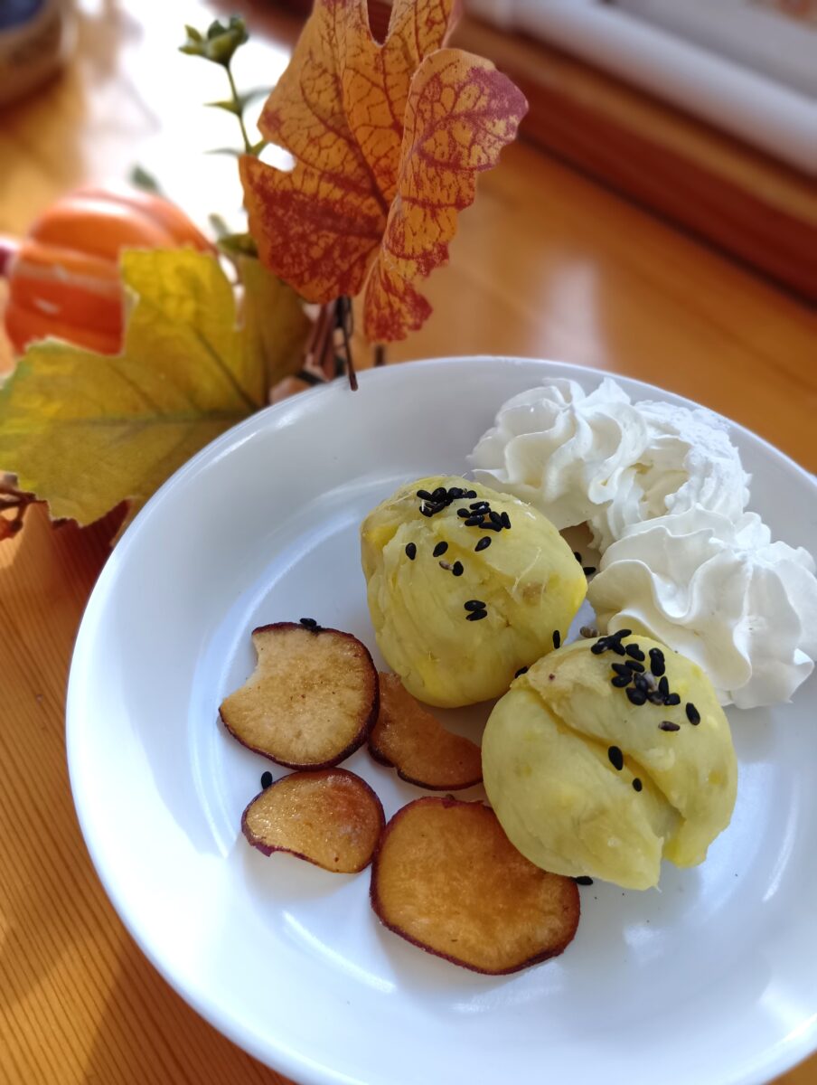最後にサツマイモチップを添えれば、「ちゃきんベニアズマちゃん しろさんスペシャル」の出来上がりです!