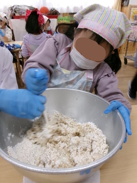 毎年とら組さんが大豆からみそ作りをしていますが、今年は新しい取り組みとして米みそを作りました。