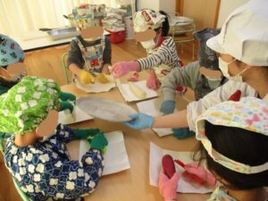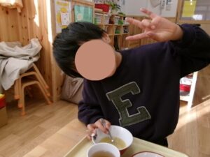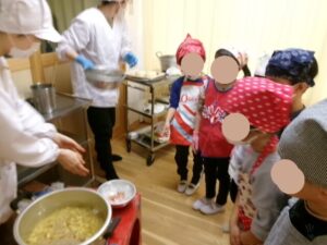できあがったみそで、みそ汁を作ることにしました。グループごとに昆布、かつおからだしを選び、具材は園で育てて収穫した大根、他には、赤、黄色、緑、の栄養素から、さつまいも、かぼちゃ、ウインナー、こんにゃくなどを子どもたちが選び入れました。